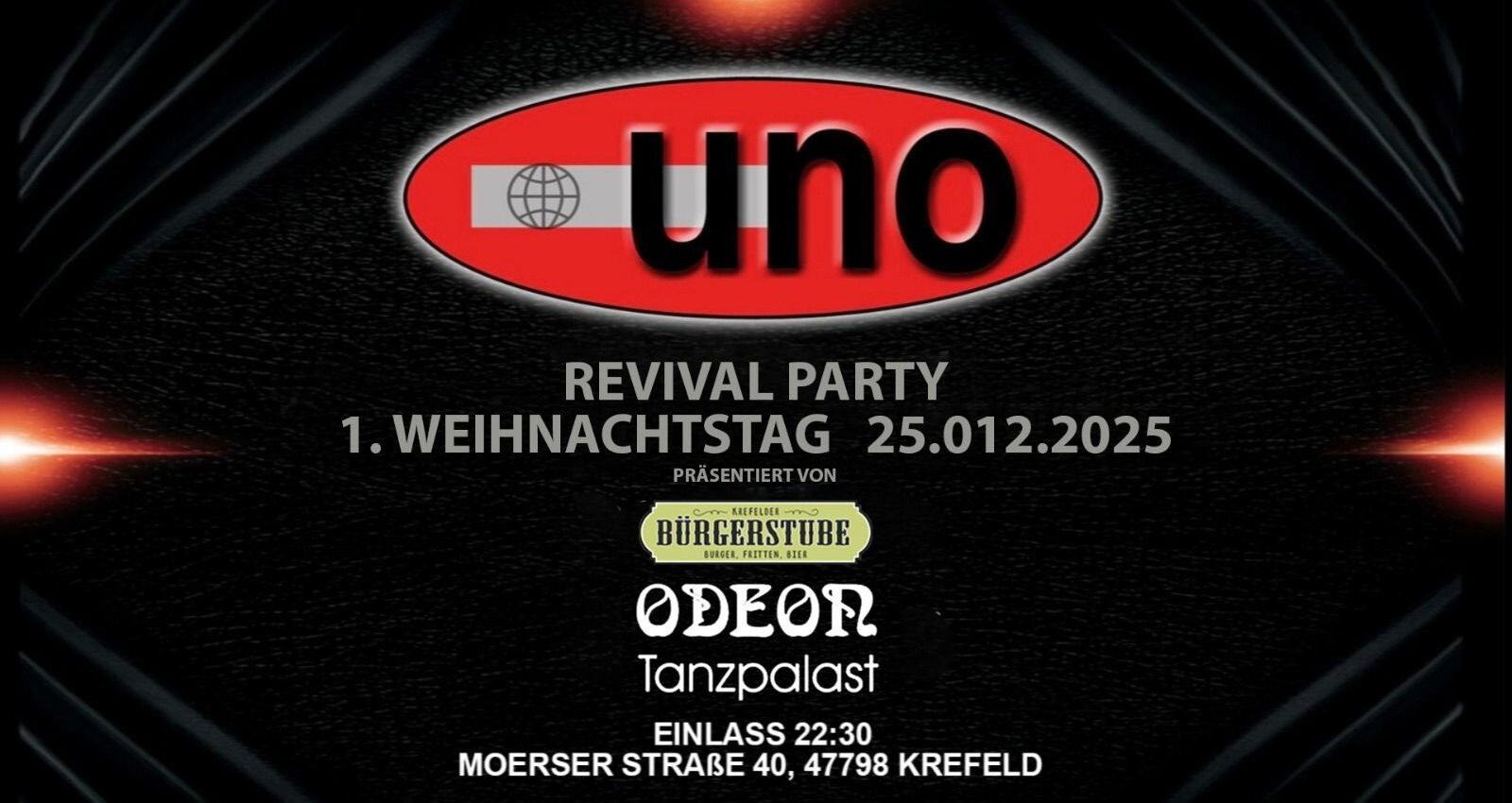 Nun ist es komplett, das Vierteljahrhundert! Zum 25. Mal startet die UNO Revival Party am Ersten Weihnachtstag und bereits seit fünf Jahren im schönen Odeon Tanzpalast. Wie Christbaum und Weihnachtsbraten hat die weihnachtliche Megaparty inzwischen Tradition. Musikalisch erwartet euch wieder eine extrem tanzbare Mischung aus House, Charts, Hip Hop und Party Classics. An den Decks stehen die UNO Residents Tim Twice – bekannt von Meilenstein sowie Luft & Liebe – und DJ TK, der ansonsten in der Düsseldorfer Boston Bar für Stimmung sorgt.