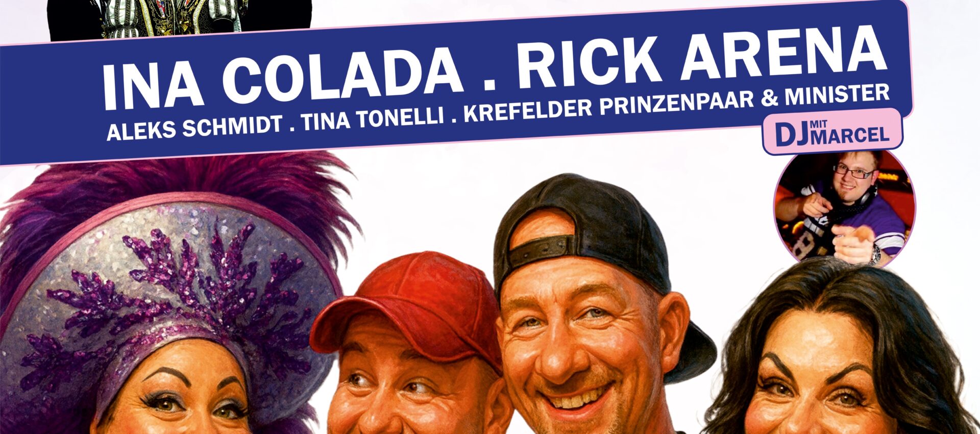 Los geht es um 18 Uhr. Mit auf der Bühne stehen die bekannten Mallorca-Künstler Ina Colada und Rick Arena – dazu der Travestie-Künstler Heiko Großmann als Miss Tammy. Durch das Programm führt der Präsident der KG Rosa Jecken Torsten van Ool – als Tina Tonelli und Aleks Schmidt.