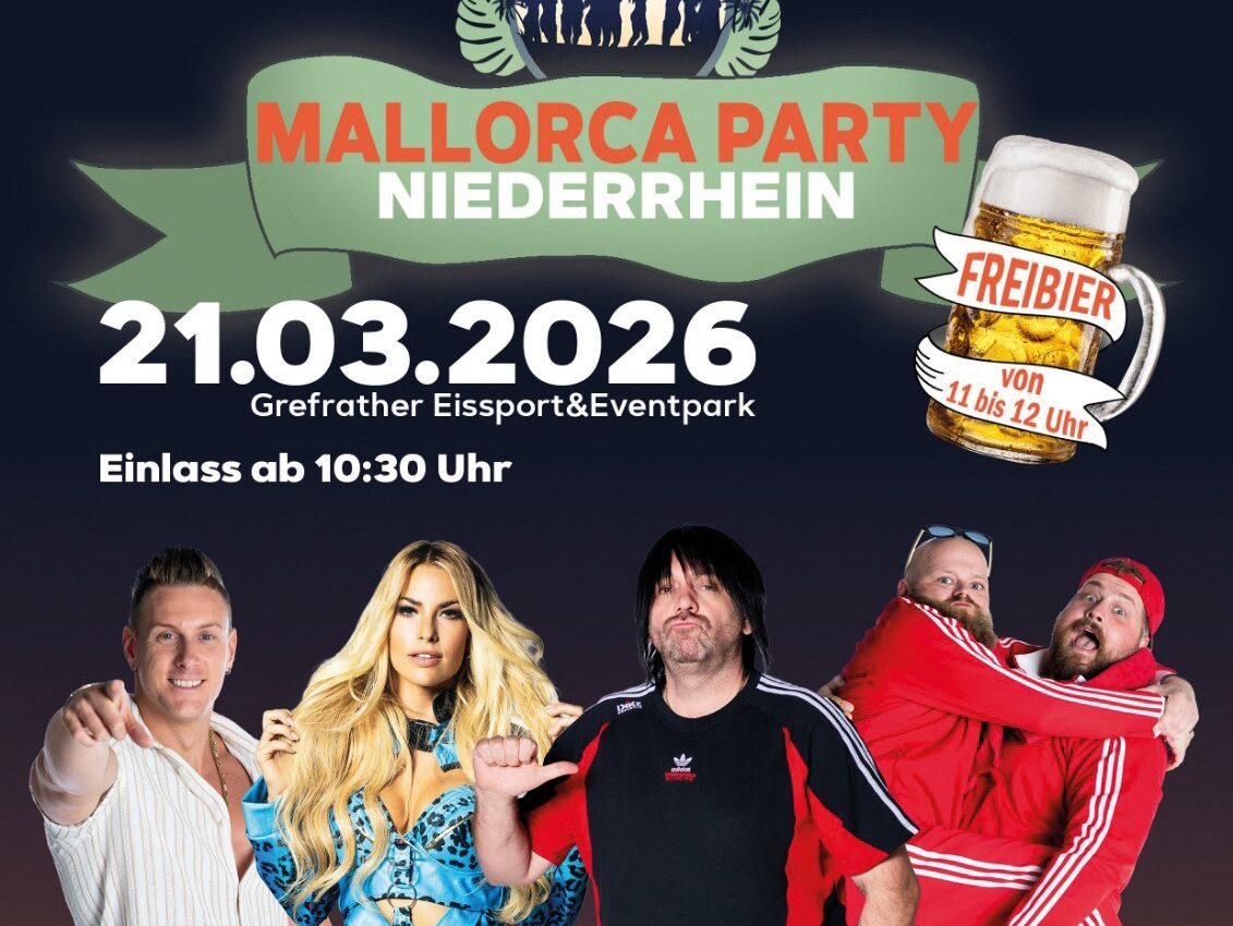 Am 21. März verwandelt sich der Grefrather Eissport & Eventpark in die heißeste Partyinsel Deutschlands. Mit Sangria, Freibier-Aktion, Foodtrucks und originalem Mallorca-Sound könnt ihr hier unter Palmen feiern – und euch sogar euer persönliches Mallorca-Shirt erstellen lassen. Für das Original-Malle-Feeling sorgen Stars wie Ikke Hüftgold, Isi Glück, Specktakel, Kreisligalegende und DJ Robin.