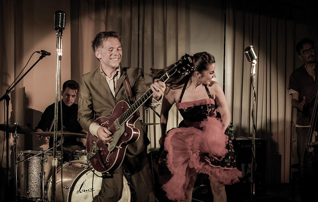 Bestgelaunter Fifties-Rock’n’Roll für tanzwütige Backfische und Halbstarke jeden Alters: Seit 2012 bringen Jenny and The Steady Go’s das musikalische Lebensgefühl der 50er-Jahre zurück ins Hier und Jetzt. Jenny Thrills frech-bezaubernde Stimme vor den beschwingten Sounds der Band entführt uns in eine Zeit, in der Musik Rock’n’Roll bedeutete und Cola ein neues Lebensgefühl. Als Mädchen noch wegen eines einzigen Hüftschwungs in Ohnmacht fielen, rote Kussmünder keinen Nude-Look kannten, Hosen Röcke waren, Jungs halbstark und Männer Gentlemen. Gleich fünf von ihnen, ausgestattet mit klassischem Instrumentarium von Gretsch-Gitarren bis zum Kontrabass, hat die singende und mitreißend tanzende Jenny Thrill an ihrer Seite, und die haben’s musikalisch faustdick hinter den Ohren. Kein Wunder, können die einzelnen Mitglieder der Steady Go’s doch zusammen auf weit über tausend Konzerte zurückschauen. Hier bleibt kein Auge trocken und keine Hüfte unbewegt…