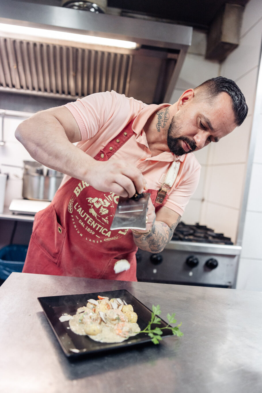 Seine Leidenschaft fürs Kochen führt er auf seinen Großvater zurück, der früher in Gelsenkirchen das Restaurant „Rossini“ betrieb.Begeistert präsentiert er seine Wettbewerbs-Pizza, mit der er bei der Deutschen Meisterschaft der Pizzabäcker antreten will. Die „Vaffanculo“ kombiniert Margherita-Basis mit Rucola, Thunfisch, Parmesan, Kirschtomaten und Chilisauce – mutig, würzig, überraschend. Der Teig ruht 72 Stunden, ist dünn ausgebacken, der Rand kross und luftig. Ebenso mutig ist übrigens der Name „Vaffanculo“ – warum, schaut bitte selbst nach…